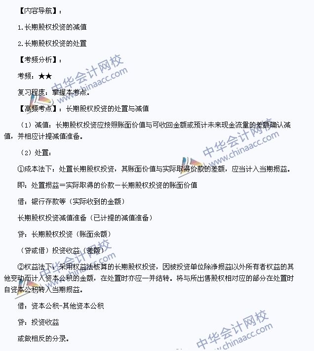 我们一起来学习2013注册会计师考试《会计》高频考点:长期股权投资的处置与减值。本考点属于《会计》第四章长期股权投资第三节长期股权投资核算方法的转换及处置。