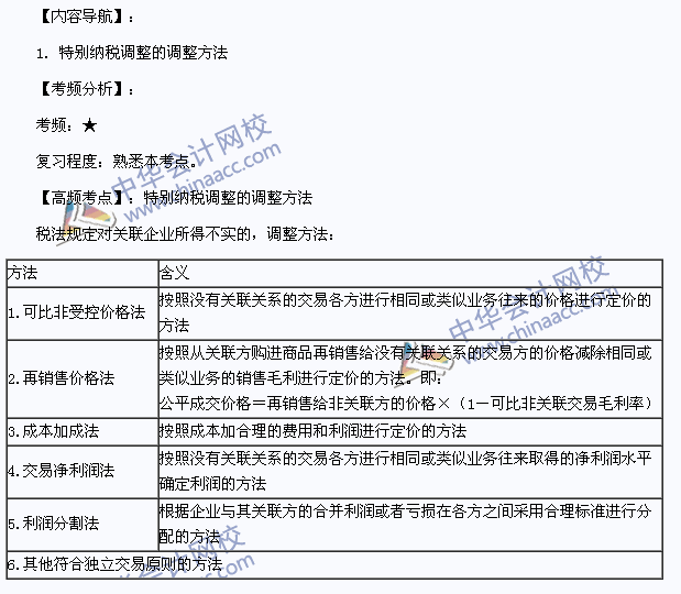 我们一起来学习2013注册会计师《税法》高频考点:特别纳税调整的调整方法。本考点是《税法》第十章企业所得税法第九节特别纳税调整的内容。