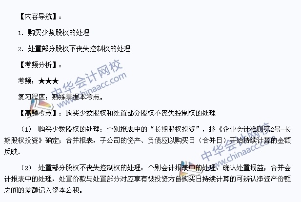我们一起来学习2013年注册会计师《会计》高频考点:购买少数股权和处置部分股权不丧失控制权的处理。本考点属于《会计》第二十四章企业合并第三节非同一控制下企业合并的处理的内容。