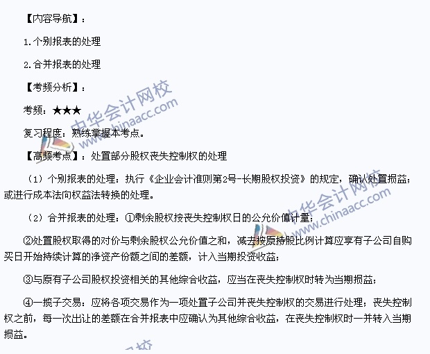 我们一起来学习2013年注册会计师《会计》高频考点:处置部分股权丧失控制权的处理。本考点属于《会计》第二十四章企业合并第三节非同一控制下企业合并的处理的内容。