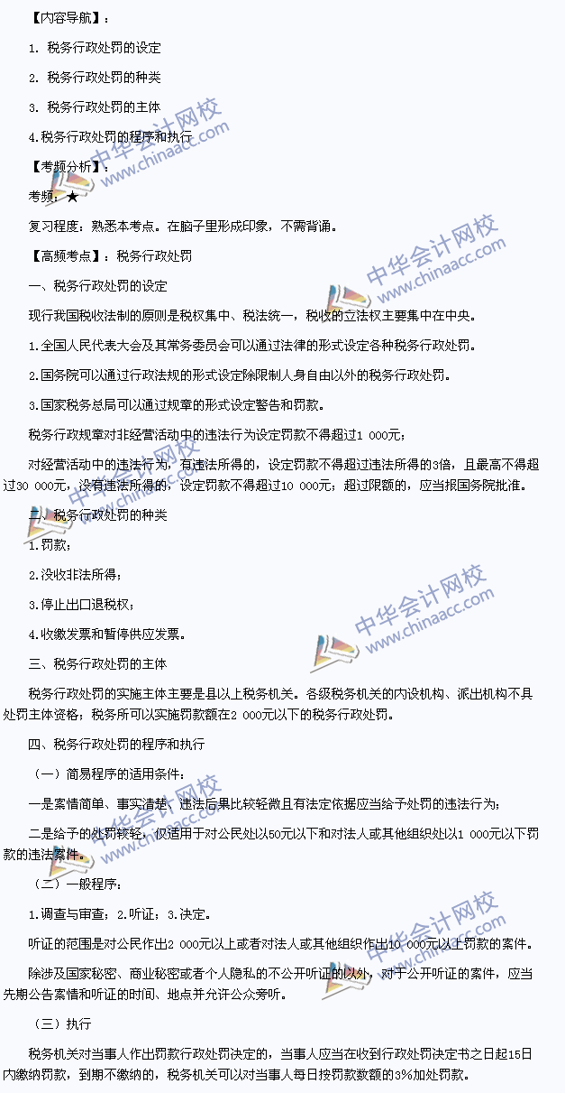 我们一起来学习2013注册会计师《税法》高频考点:税务行政处罚。本考点是《税法》第十三章税务行政法制第一节税务行政处罚的内容。