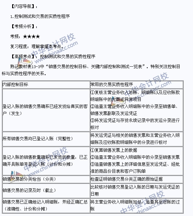 我们一起来学习2013年注册会计师《审计》高频考点:控制测试和交易的实质性程序。本考点属于《审计》第十三章销售与收款循环的审计第二节销售与收款循环的内部控制和控制测试的内容。