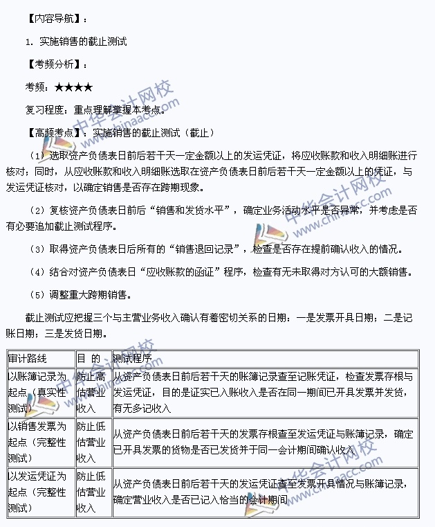 我们一起来学习2013年注册会计师《审计》高频考点:实施销售的截止测试。本考点属于《审计》第十三章销售与收款循环的审计第三节销售与收款循环的实质性程序的内容。