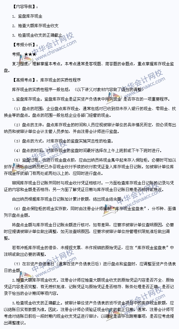 我们一起来学习2013年注册会计师考试《审计》高频考点:库存现金的实质性程序。本考点属于《审计》第十六章货币资金的审计第二节库存现金审计的内容。