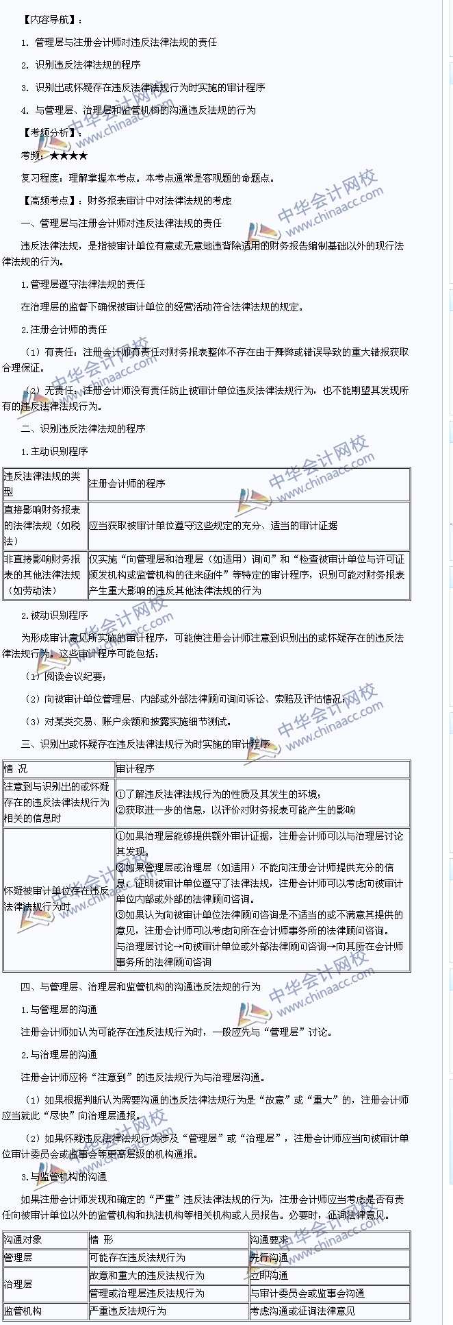 我们一起来学习2013年注册会计师考试《审计》高频考点:财务报表审计中对法律法规的考虑。本考点属于《审计》第十七章对舞弊和法律法规的考虑第二节财务报表审计中对法律法规的考虑的内容。