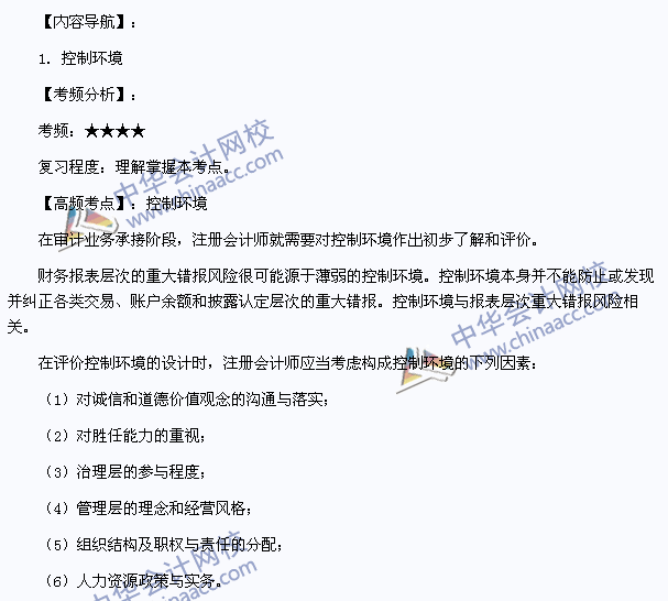 我们一起来学习2013注册会计师《审计》高频考点:控制环境。本考点属于《审计》第十一章风险评估第四节了解被审计单位内部控制的内容。