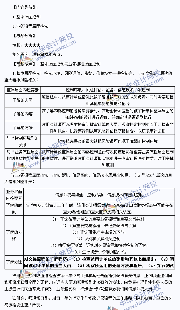 我们一起来学习2013注册会计师《审计》高频考点:整体层面控制与业务流程层面控制。本考点属于《审计》第十一章风险评估第四节了解被审计单位的内部控制的内容。