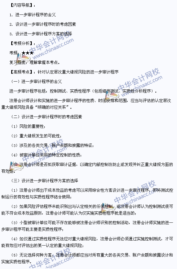 我们一起来学习2013注册会计师《审计》高频考点:针对认定层次重大错报风险的进一步审计程序。本考点属于《审计》第十二章风险应对第二节针对认定层次重大错报风险的进一步审计程序的内容。