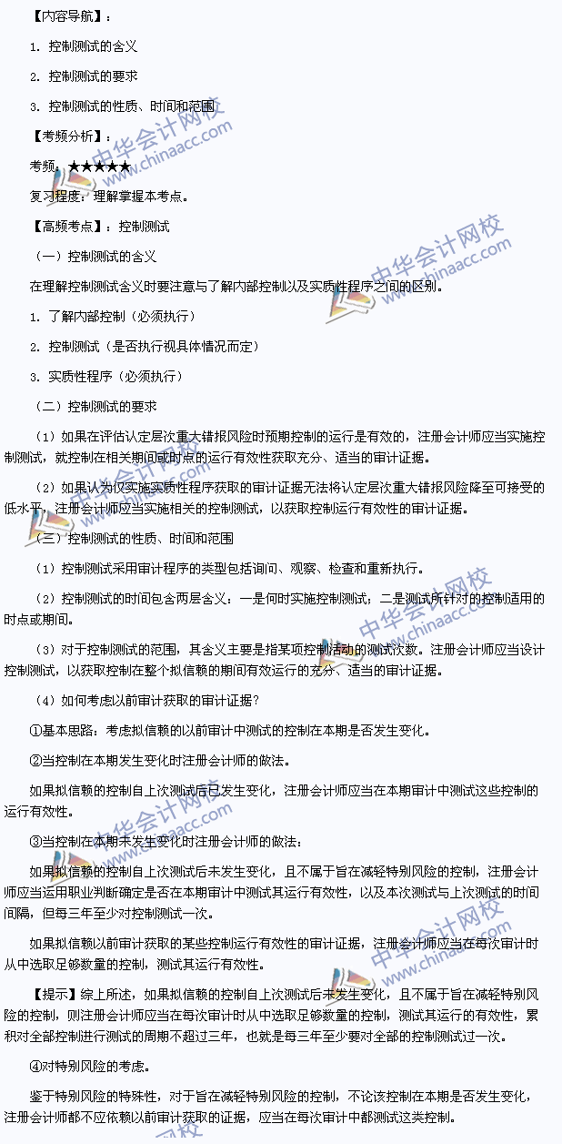 我们一起来学习2013注册会计师《审计》高频考点:控制测试。本考点属于《审计》第十二章风险应对第三节控制测试的内容。