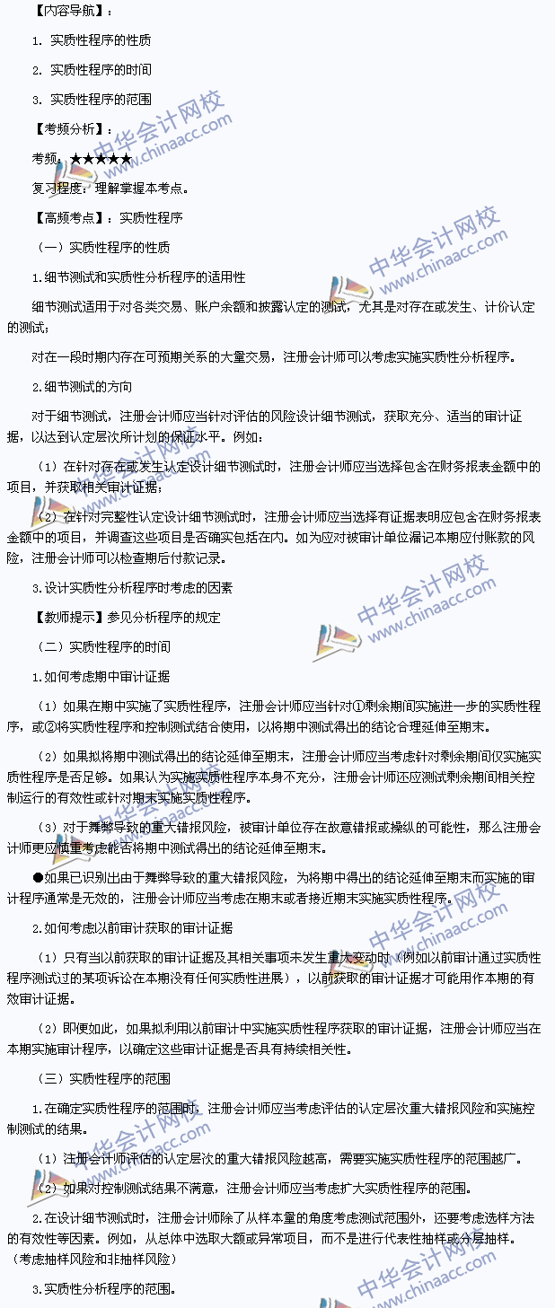 我们一起来学习2013注册会计师《审计》高频考点:实质性程序。本考点属于《审计》第十二章风险应对第四节实质性程序的内容。