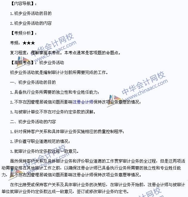 我们一起来学习2014注册会计师考试《审计》高频考点:初步业务活动。本考点属于《审计》第二章审计计划第一节初步业务活动的内容。