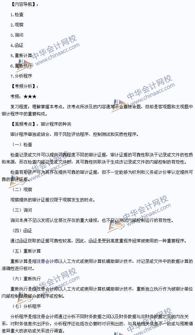 我们一起来学习2014注册会计师考试《审计》高频考点:审计程序的种类。本考点属于《审计》第三章审计证据第二节获取审计证据的审计程序的内容。