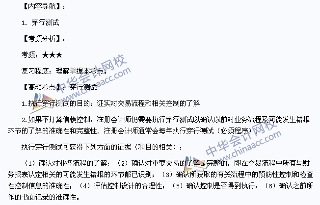 我们一起来学习2014注册会计师考试《审计》高频考点:穿行测试。本考点属于《审计》第七章风险评估第四节了解被审计单位的内部控制的内容。