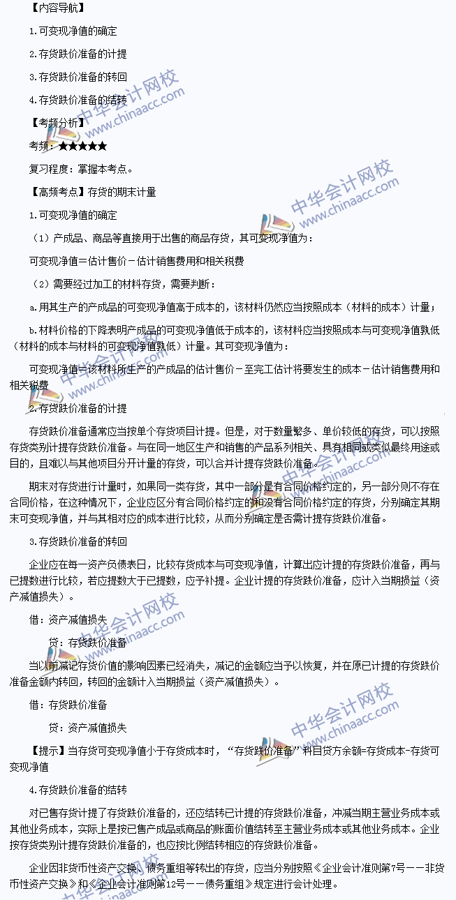 我们一起来学习2014《会计》高频考点:存货的期末计量。本考点属于《会计》第三章存货第三节期末存货计量的内容。