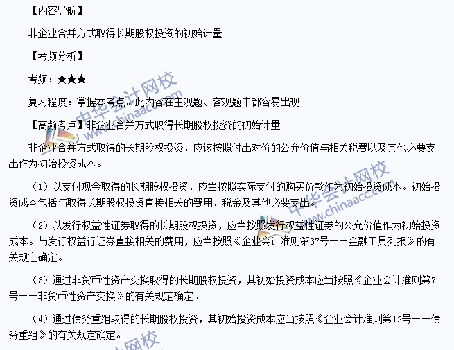 我们一起来学习2014注册会计师《会计》高频考点:非企业合并方式取得长期股权投资的初始计量。本考点属于《会计》第四章长期股权投资第一节长期股权投资的初始计量的内容。
