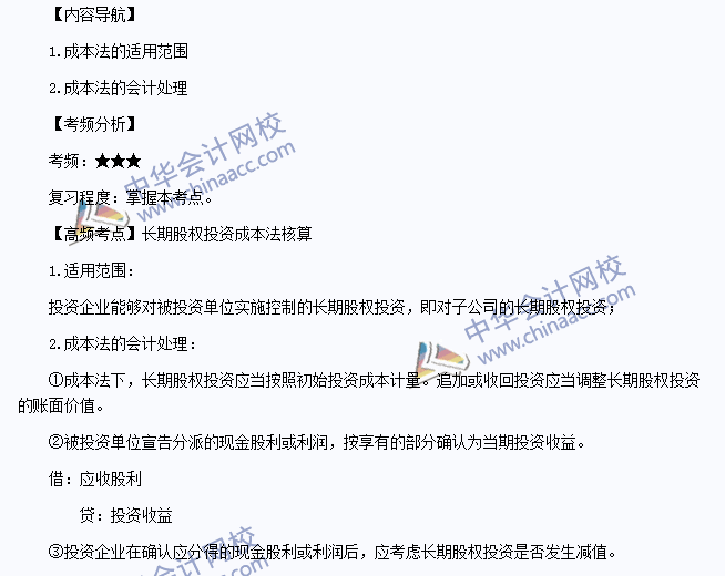 我们一起来学习2014《会计》高频考点:长期股权投资成本法核算。本考点属于《会计》第四章长期股权投资第二节长期股权投资的后续计量的内容。