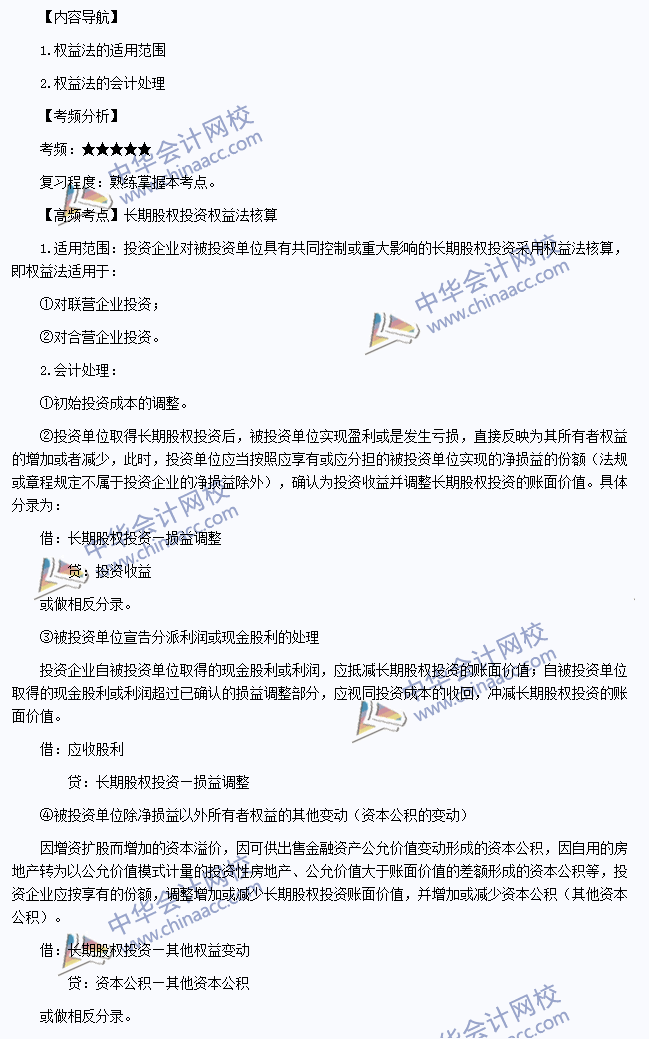 我们一起来学习2014《会计》高频考点:长期股权投资权益法核算。本考点属于《会计》第四章长期股权投资第二节长期股权投资的后续计量的内容。