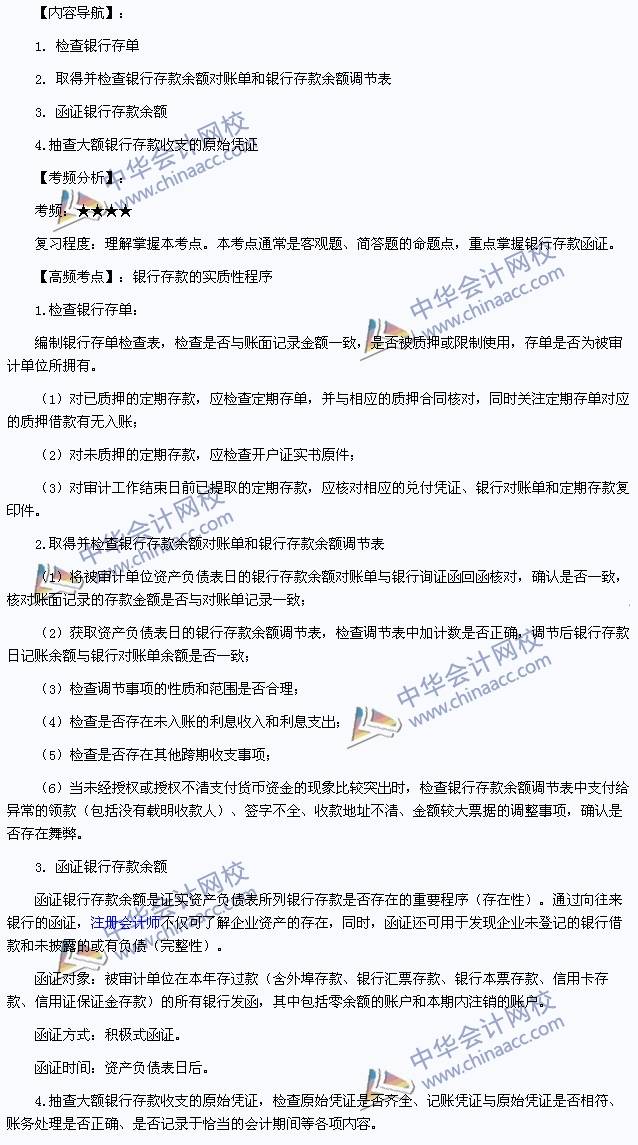 我们一起来学习2014注册会计师考试《审计》高频考点:银行存款的实质性程序。本考点属于《审计》第十二章货币资金的审计第三节银行存款审计的内容。