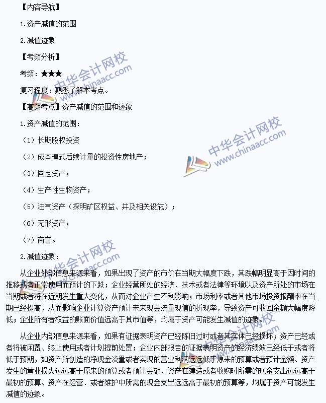 我们一起来学习2014《会计》高频考点:资产减值的范围和迹象。本考点属于《会计》第八章资产减值第一节资产减值概述的内容。