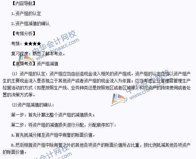 我们一起来学习2014《会计》高频考点:资产组减值。本考点属于《会计》第八章资产减值第四节资产组的认定及减值处理的内容。