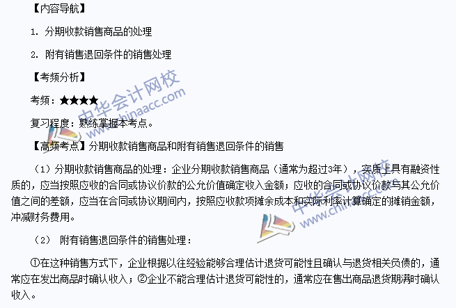我们一起来学习2014《会计》高频考点:分期收款销售商品和附有销售退回条件的销售。本考点属于《会计》第十一章收入、费用和利润第一节收入的内容。