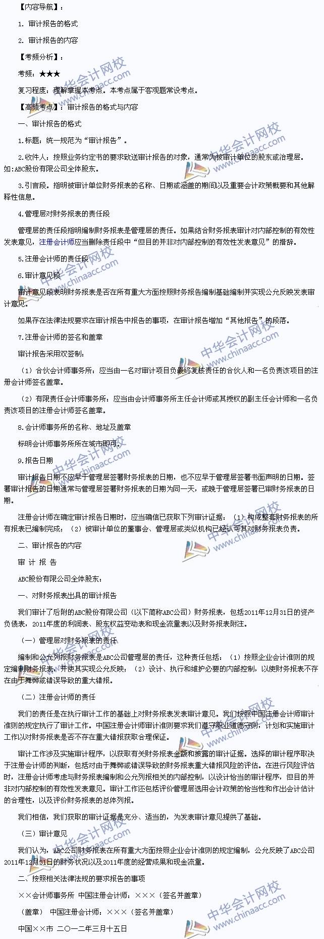 我们一起来学习2014注册会计师考试《审计》高频考点:审计报告的格式与内容。本考点属于《审计》第十九章审计报告第三节审计报告的基本内容的内容。