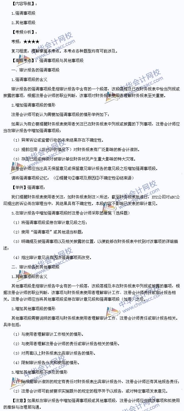 我们一起来学习2014注册会计师《审计》高频考点:强调事项段与其他事项段。本考点属于《审计》第十九章审计报告第四节非标准审计报告的内容。