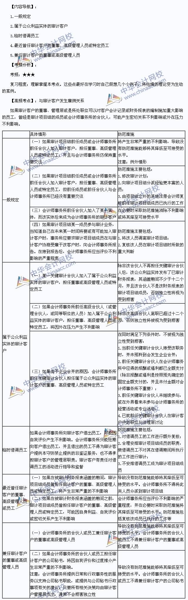 我们一起来学习2014注册会计师《审计》高频考点:与审计客户发生雇佣关系。本考点属于《审计》第二十二章审计业务对独立性的要求第四节与审计客户发生雇佣关系的内容。