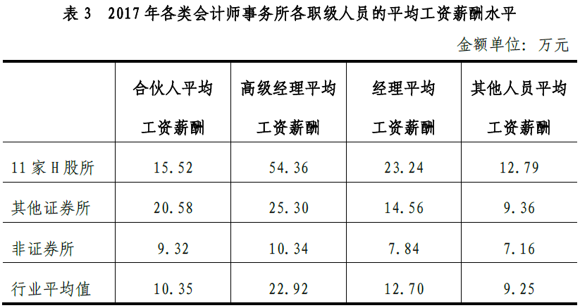 从表中可以看出:2017年度,全行业合伙人平均工资薪酬为10.35万元(由于合伙人以分红为主要收入来源,因此平均工资薪酬较低属正常现象),高级经理平均工资薪酬为22.92万元,经理平均工资薪酬为12.70万元,其他人员平均工资薪酬为9.25万元。