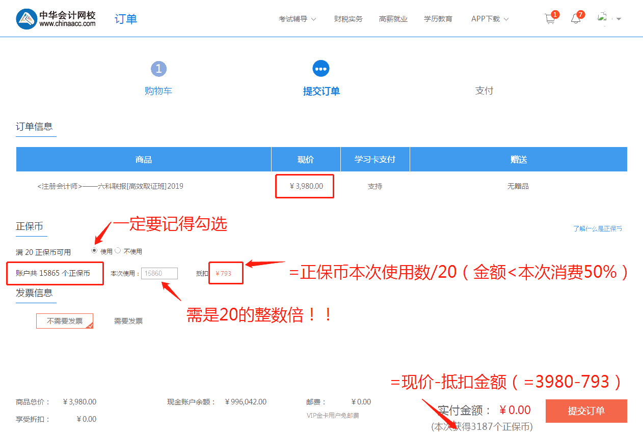 本次抵扣金额=本次使用正保币数量(20的整数倍)/20;即如上图=15860/20=793