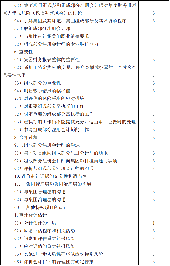 4.财务报表审计中对特殊项目的考虑,包括对舞弊和法律法规的考虑、审计沟通、对集团财务报表审计的特殊考虑、利用他人的工作,以及对会计估计、关联方和期初余额等其他特殊项目的审计;