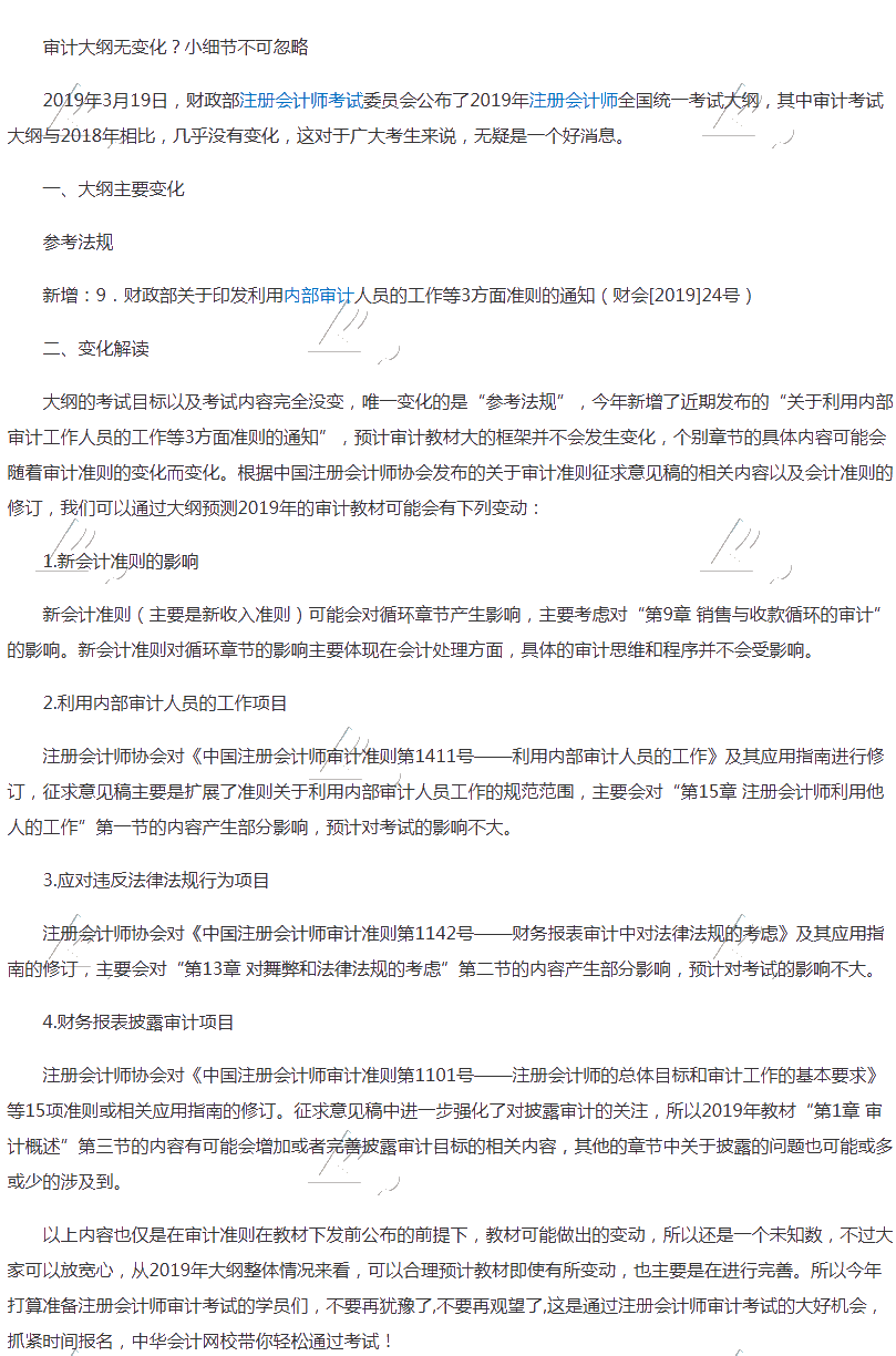 2019年审计大纲已经公布(点击查看>>)与2018年大纲的对比也已经为各位学员朋友们整理好(点击查看>>)2019年的注会课程也已经为各位学员准备好啦!(点击查看>>)