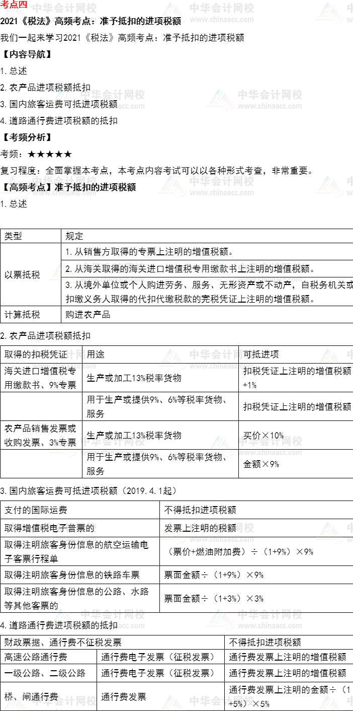 我们一起来学习2021年《税法》高频考点:准予抵扣的进项税额。本考点属于《税法》第二章增值税法的内容。