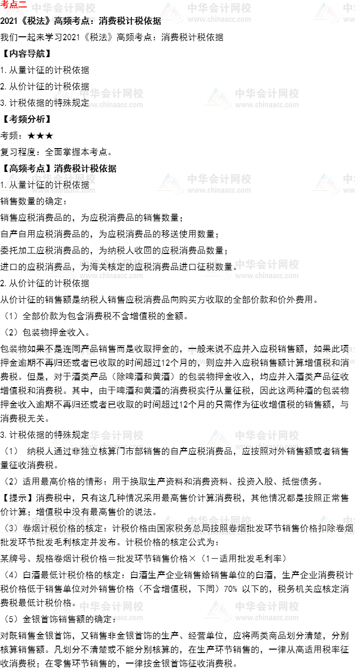 我们一起来学习2021年《税法》高频考点:消费税计税依据。本考点属于《税法》消费税法第三章的内容。