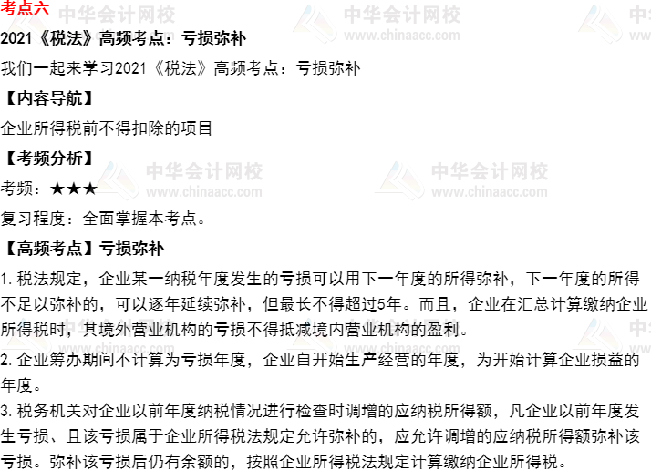 我们一起来学习2021年《税法》高频考点:亏损弥补。本考点属于《税法》第四章企业所得税法的内容。