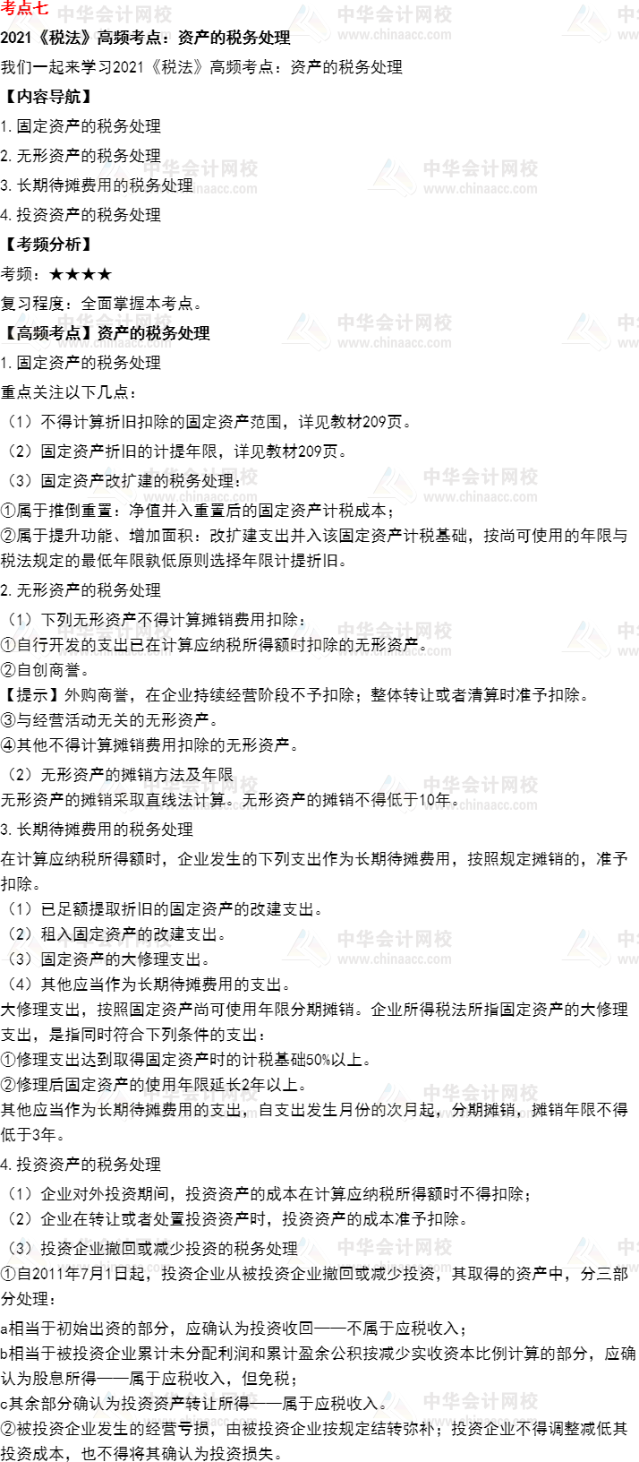 我们一起来学习2021年《税法》高频考点:资产的税务处理。本考点属于《税法》第四章企业所得税法的内容。