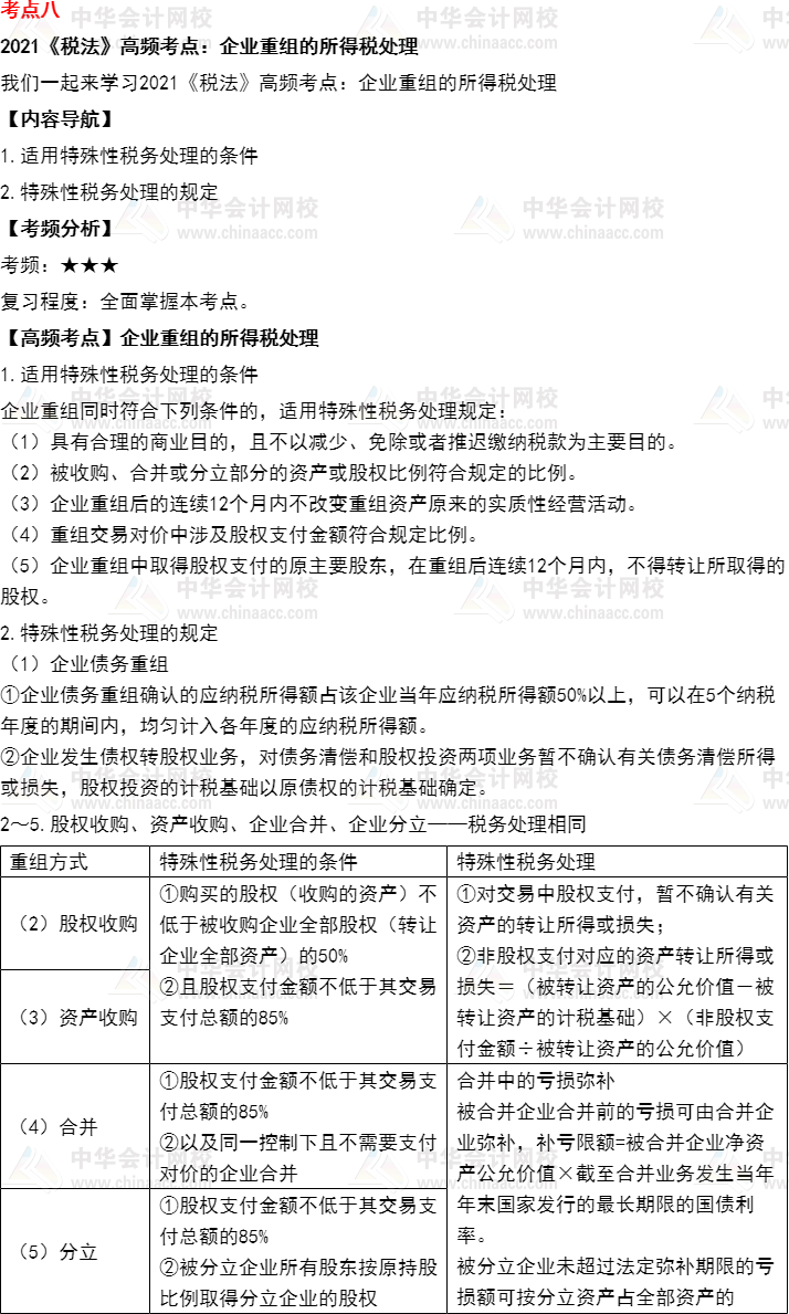 我们一起来学习2021年《税法》高频考点:企业重组的所得税处。本考点属于《税法》第四章企业所得税法的内容。