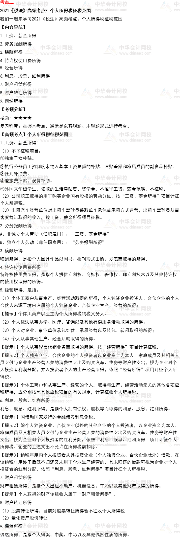 我们一起来学习2021年《税法》高频考点:个人所得税征税范围。本考点属于《税法》第五章个人所得税法的内容。