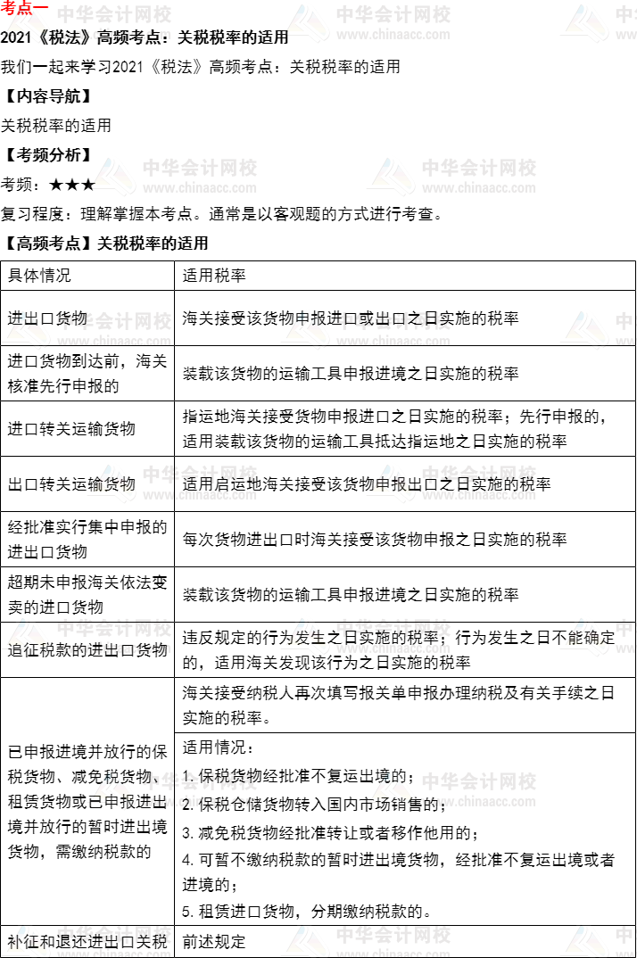 我们一起来学习2021年《税法》高频考点:关税税率的适用。本考点属于《税法》第七章关税法和船舶吨税法的内容。