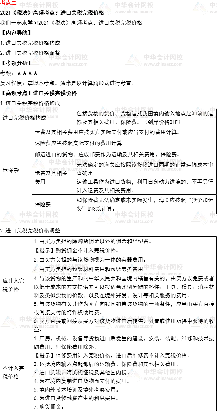我们一起来学习2021年《税法》高频考点:进口关税完税价。本考点属于《税法》第七章关税法和船舶吨税法的内容。
