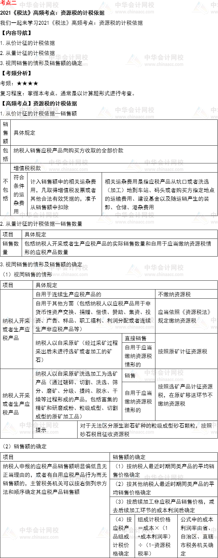 我们一起来学习2021年《税法》高频考点:资源税的计税依据。本考点属于《税法》第八章资源税法和环境保护税法的内容。