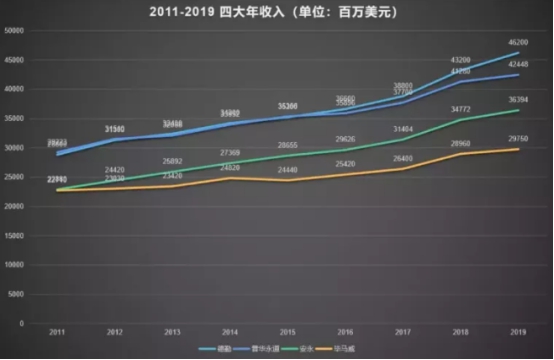 2020年由于疫情影响,在市场不景气的情况下,注册会计师行业仍旧保持平稳抬升。四大,作为财会人的梦想之地,更是不负众望,自2011年起,收入均保持增长的势头,其中,普华永道、安永、德勤三家攀升最快。