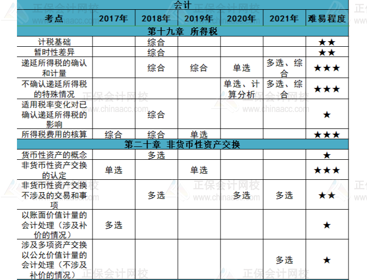 2017年至2021年注会《会计》各章知识点常出题型整理结果如下: