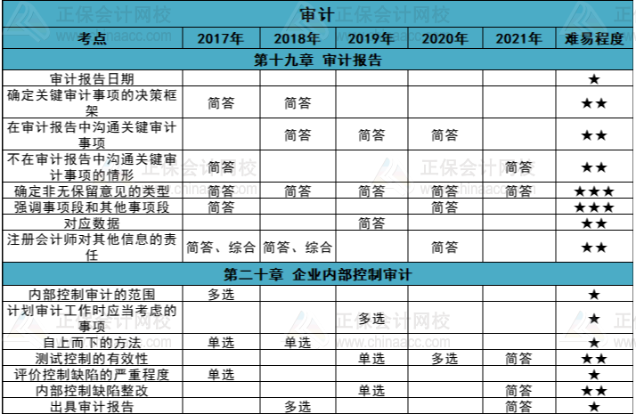 2017年至2021年注会《审计》各章知识点常出题型&难易程度整理结果如下: