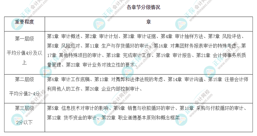 注会审计教材共分为23章,将审计的章节按重要程度分为3层,如表所示: