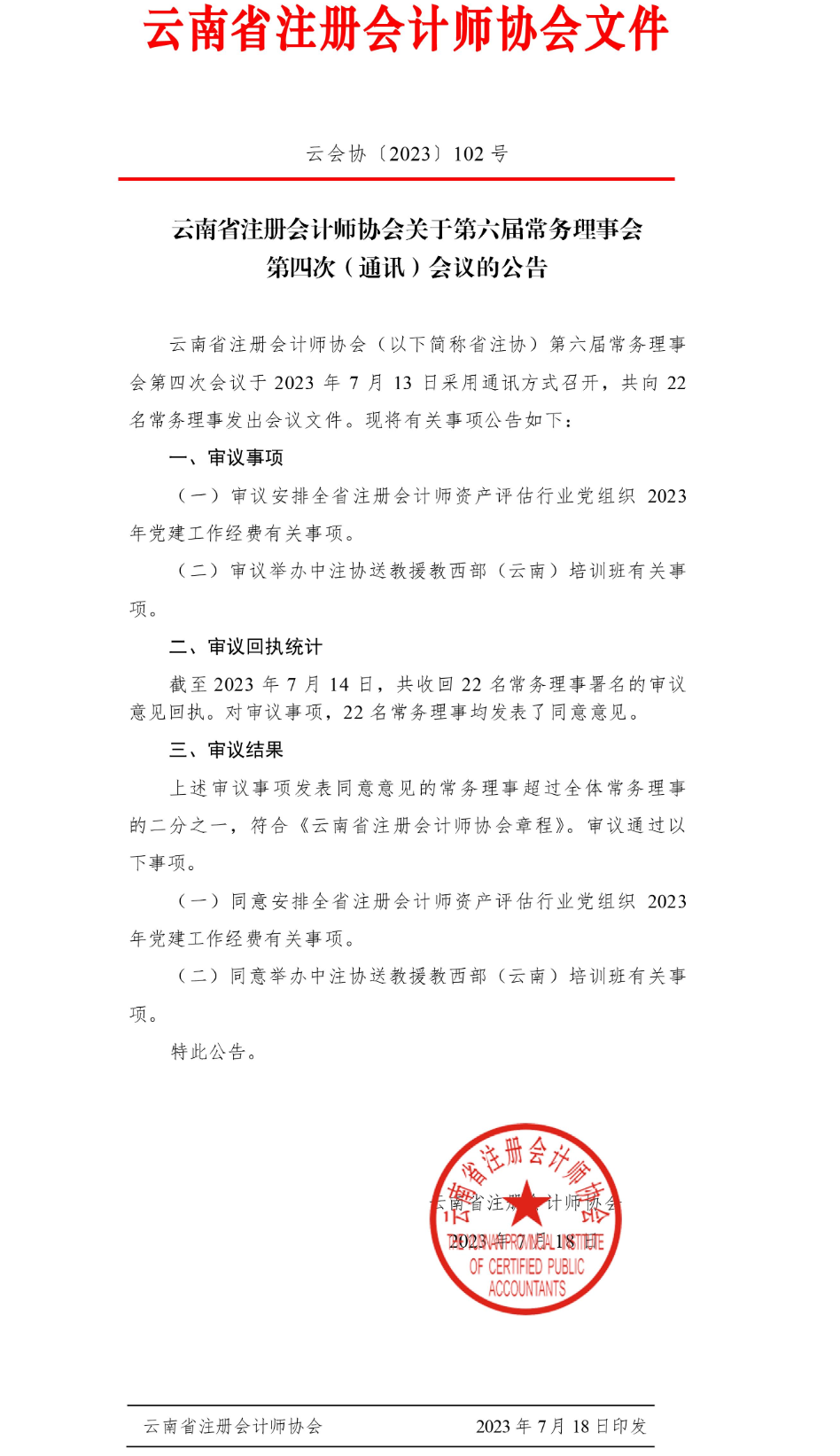 云南省注册会计师协会关于第六届常务理事会第四次(通讯)会议的公告