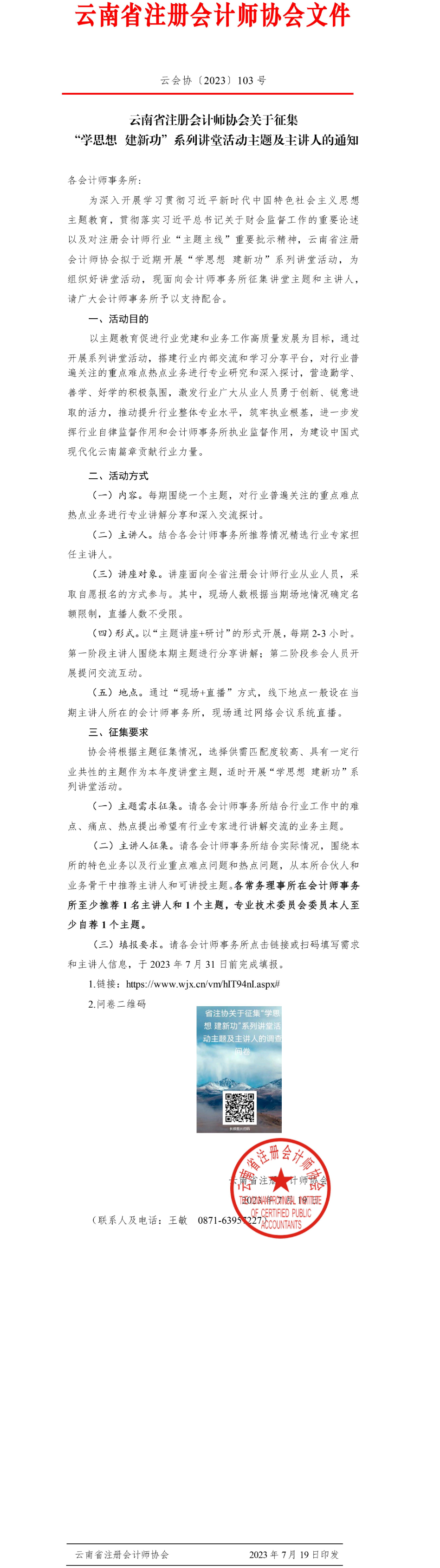 近日,云南省注册会计师协会发布关于征集“学思想 建新功”系列讲堂活动主题及主讲人的通知,具体详情如下: