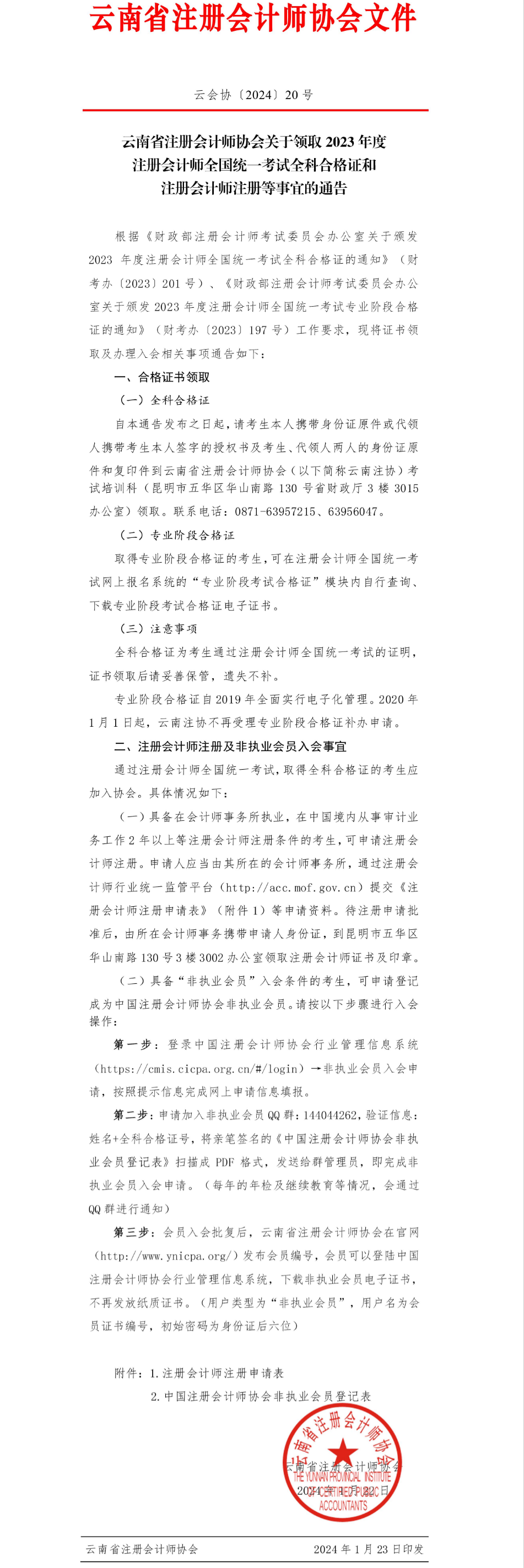 云南省注册会计师协会关于领取2023年度注册会计师全国统一考试全科合格证和注册会计师注册等事宜的通告