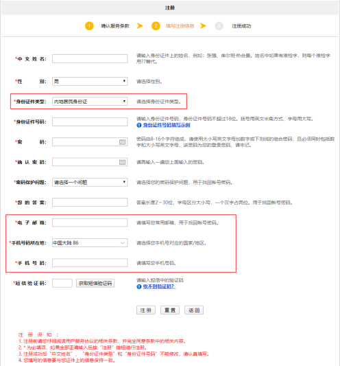 新报名的考生报名时需要在“中注协报名系统”注册新账号,填写身份证件号码、电子邮箱、手机号码所在地、手机号码等信息,如下图所示: