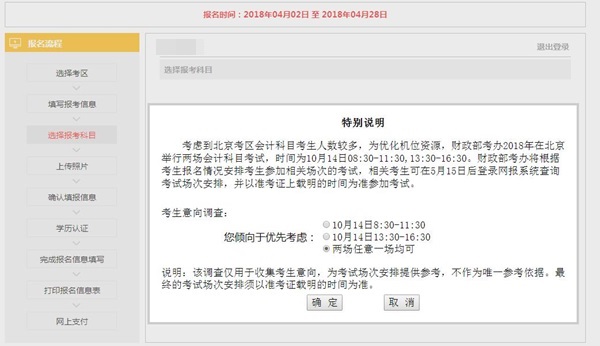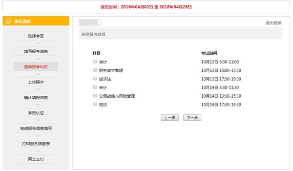 第四步:选择报考科目,各科的考试时间在后面明确标注,各位考生请根据自己的实际情况选择报考科目。